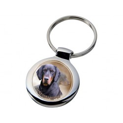 Elegant and massive metal key tag in a black casing on silk embedding. Engraving possible on the backside of the key tag.